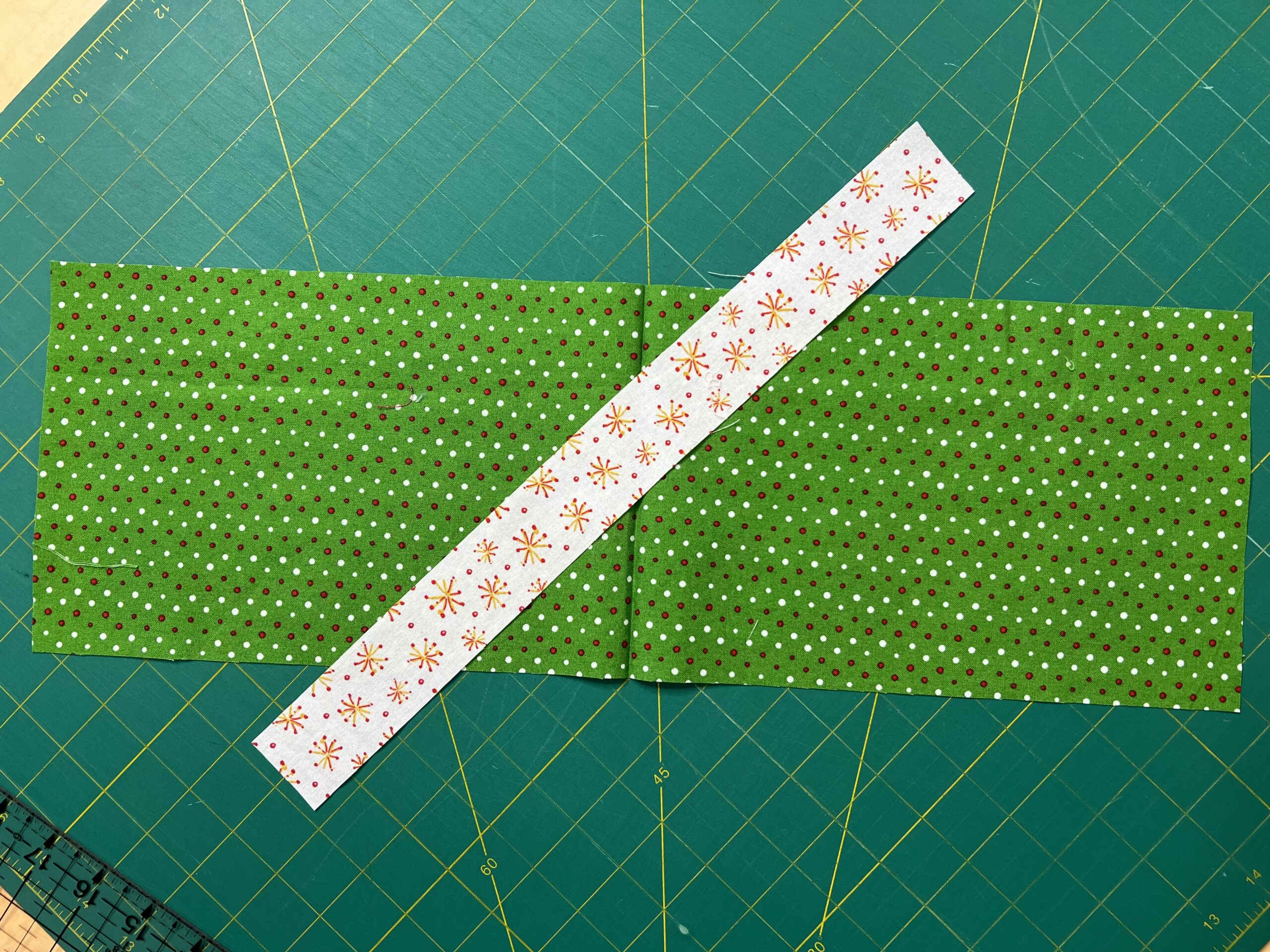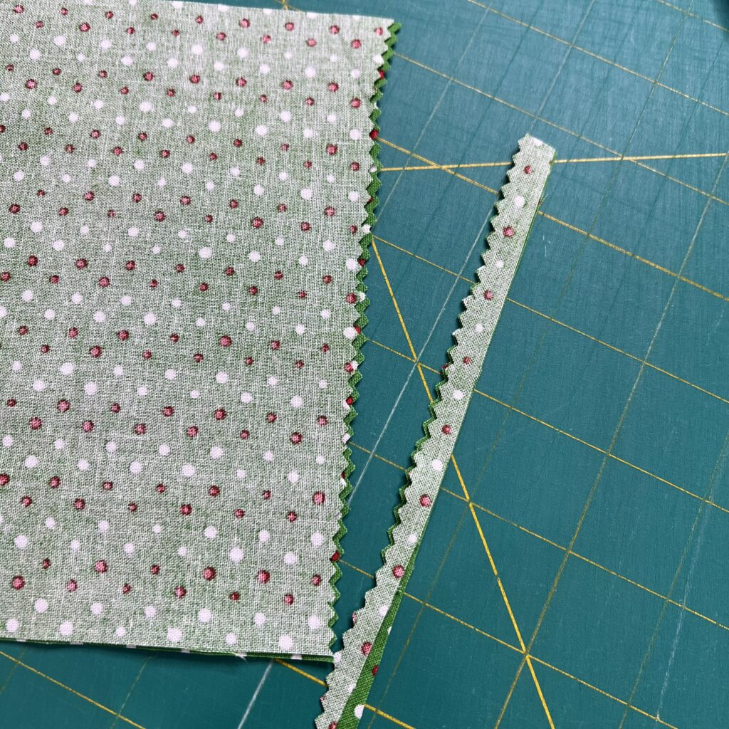 For my treat bag I used one piece of fabric that measures 6 1/2″ x 20″ and one strip that was 1 1/2″ x 15″.