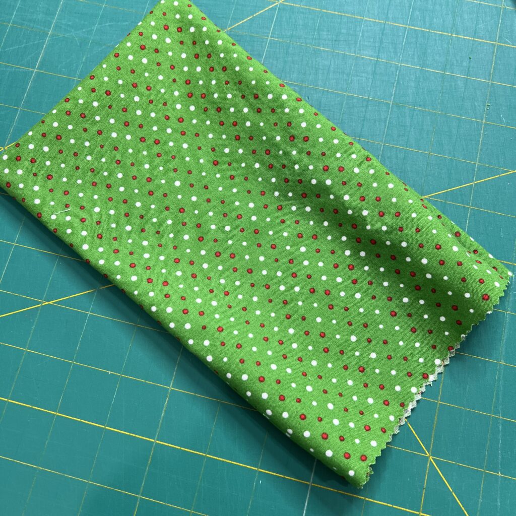 Fold the fabric in half along the short end with right sides facing. To help avoid some fraying, use pinking shears to trim the short edges.