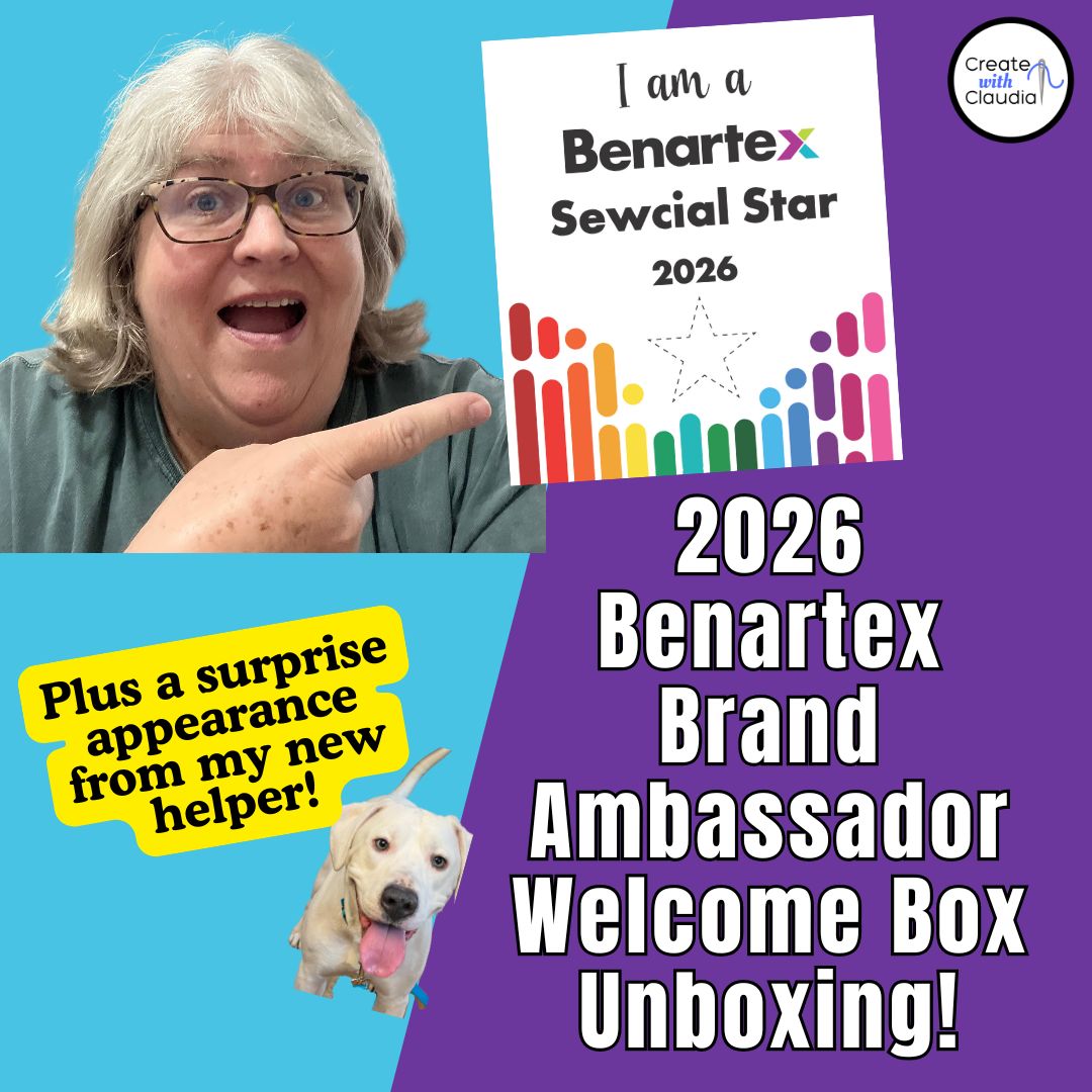 I am so honored to have been chosen as one of Benartex’s 2026 Brand Ambassadors. As one of their Sewcial Stars I will be receiving all sorts of goodies throughout the year. I thought it would be fun to recap what I received in my generous Welcome box. Join me while I’m unboxing my Benartex Brand Ambassador Welcome box. I did a video in real time or, you can see all of the goodies later in this post.
