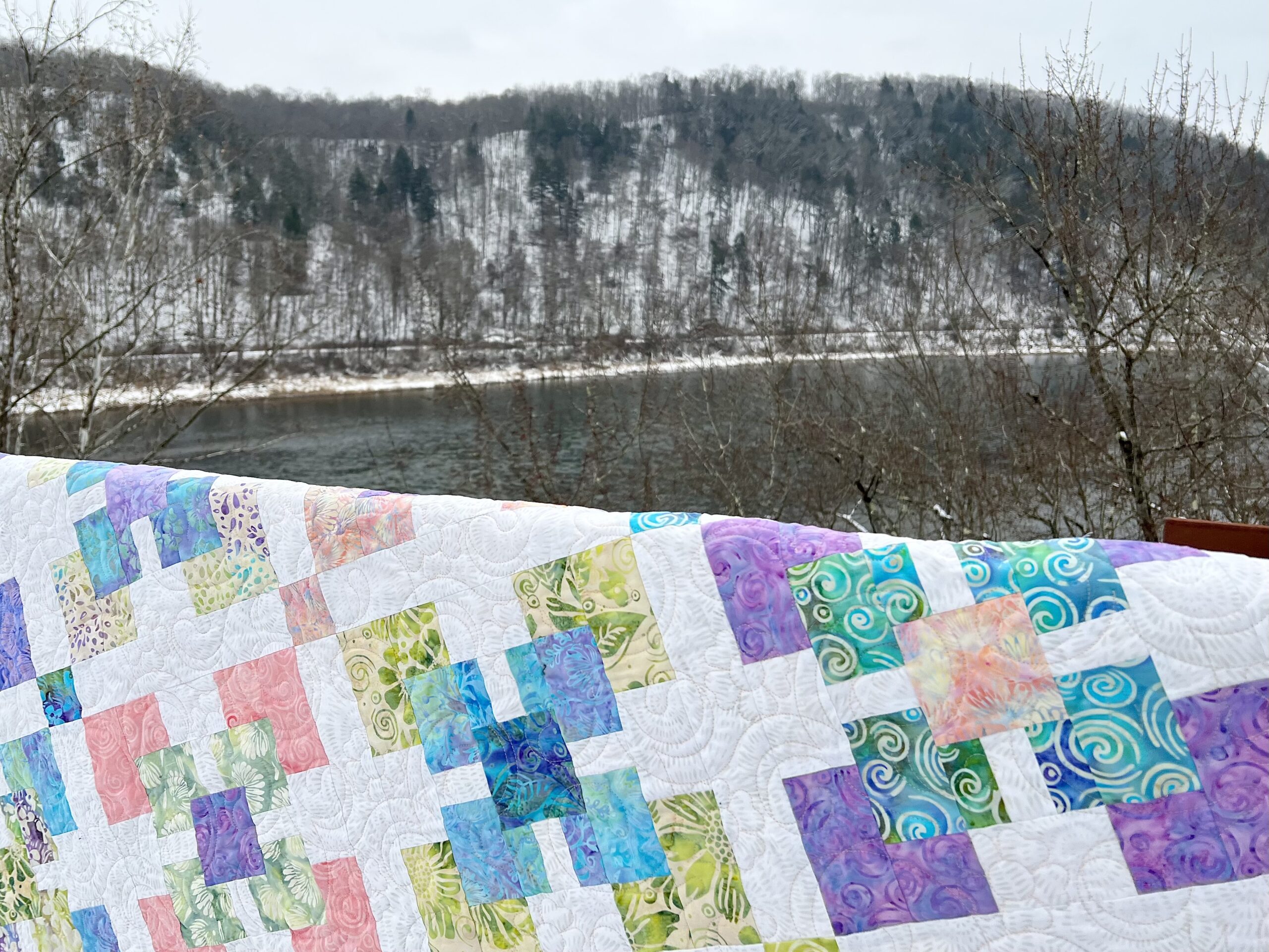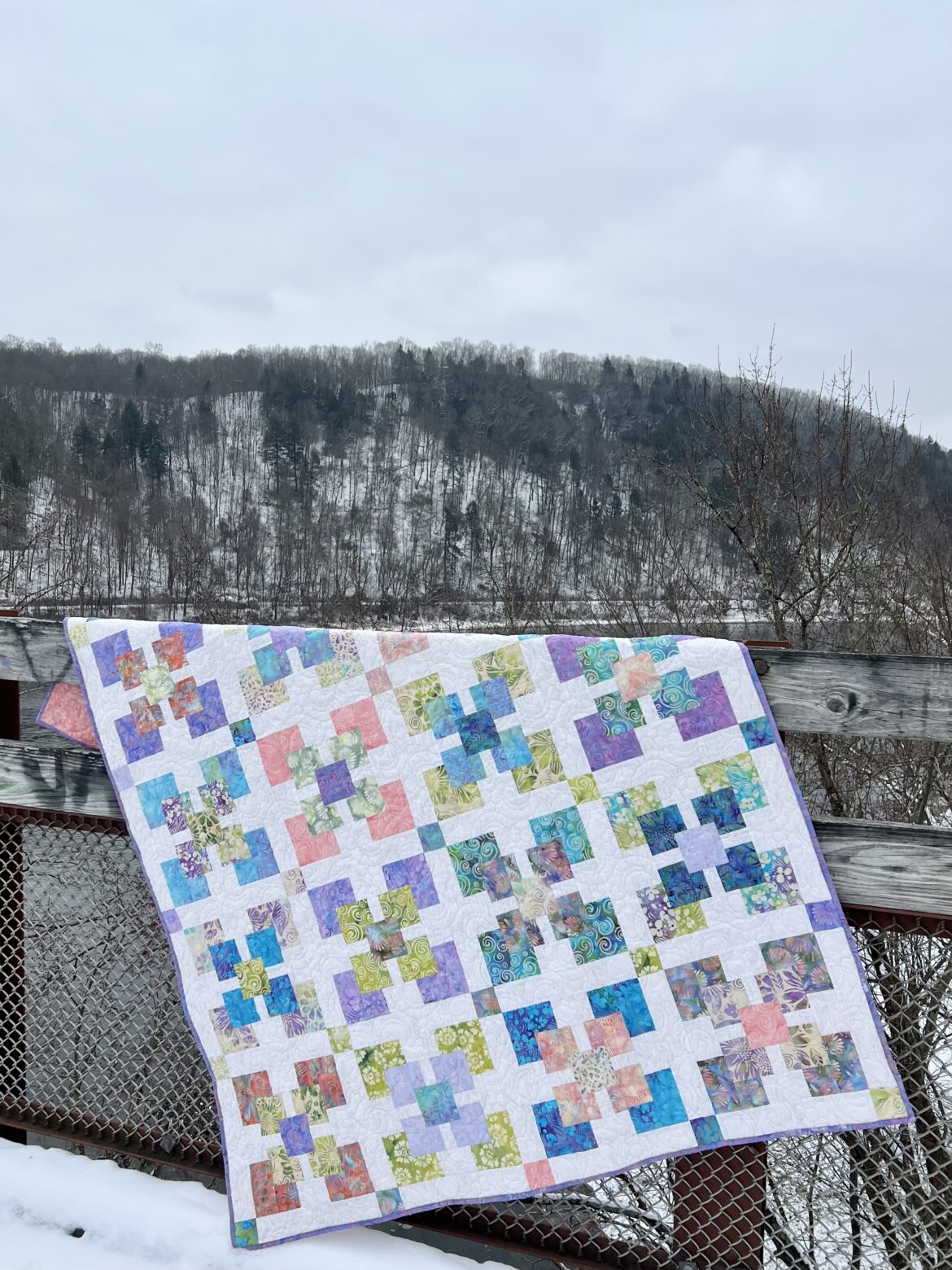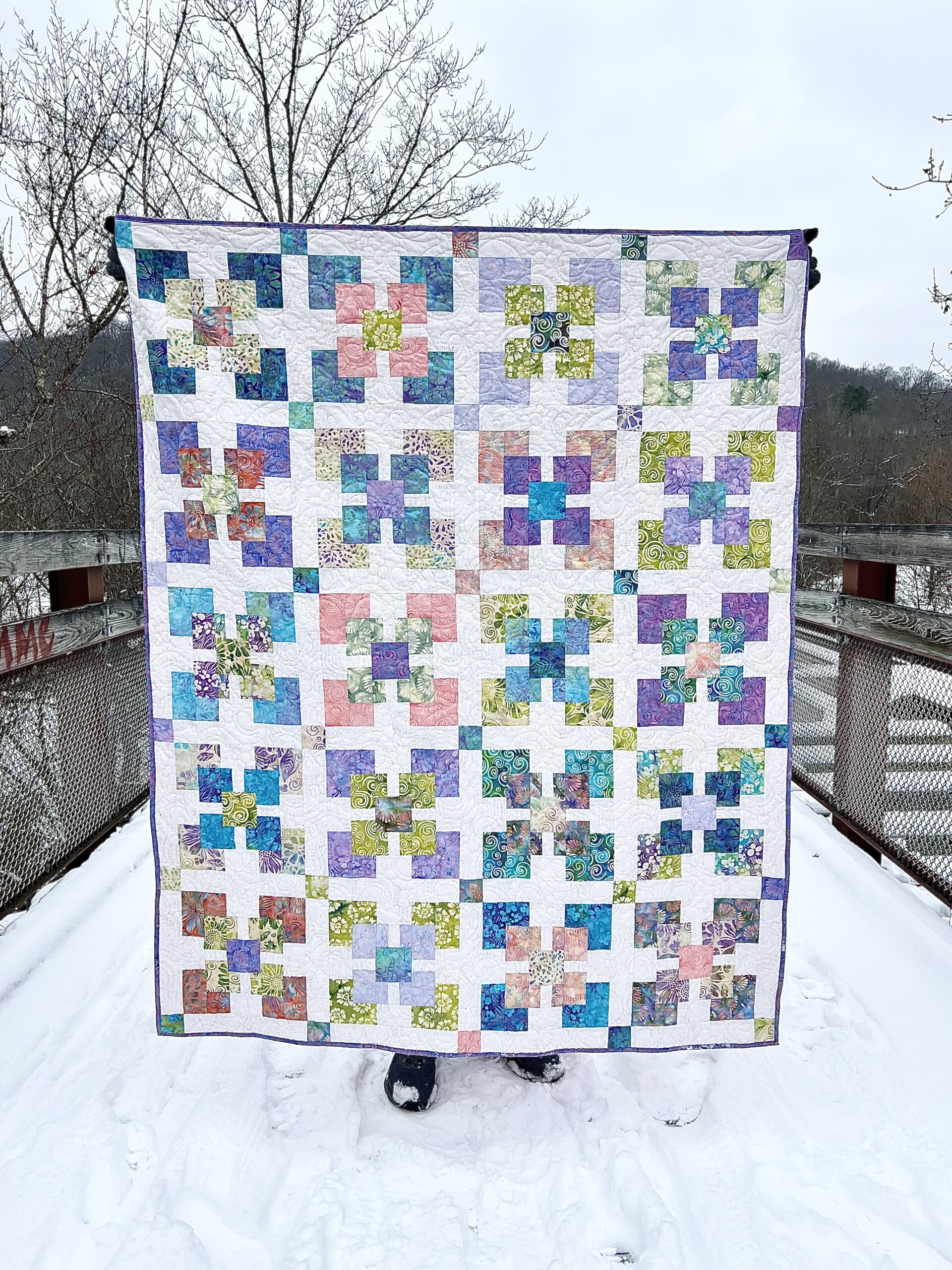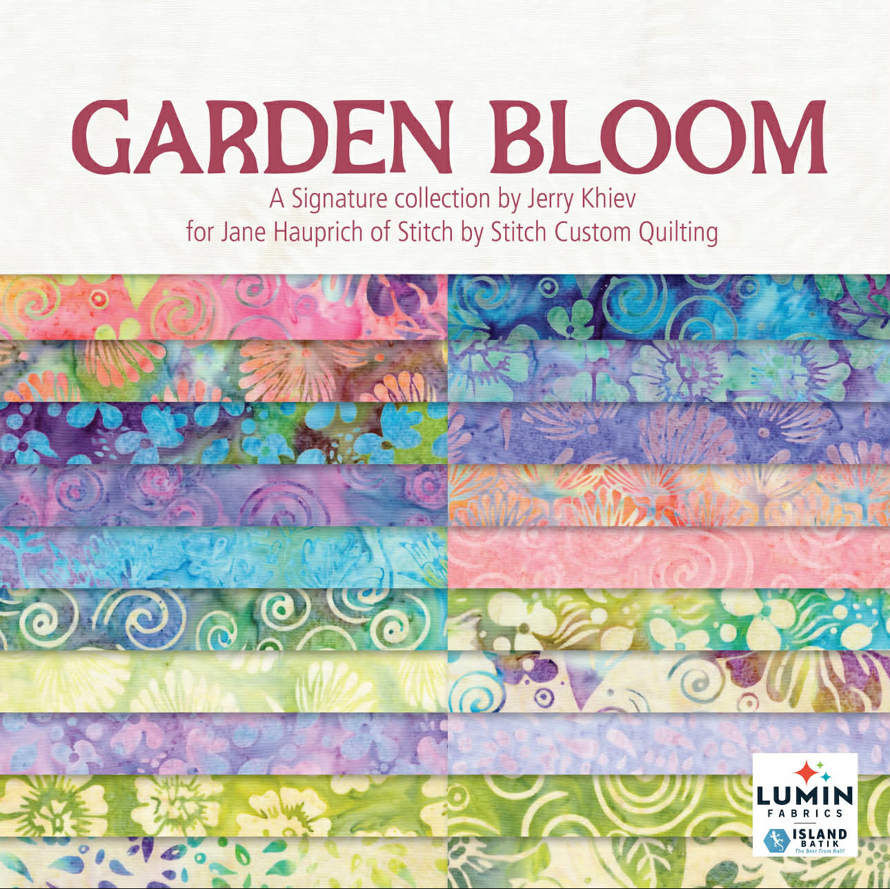 I’m not sure what the weather is like where you live, but as I write this, the temperature outside is about 10 degrees. Yikes! So I’m sitting inside at my computer with a nice cup of coffee and this pretty quilt to warm me up. The fabrics in my “Stained Glass” pattern just scream spring and summer and brighten up any day. I made this quilt as part of a Garden Bloom fabric blog hop featuring this beautiful new fabric line from Island Batik, a division of Lumin Fabrics.