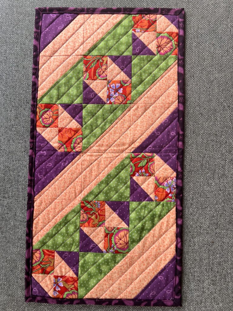 This runner was made with two “Flutter” blocks that I had made for a tutorial. I love the movement created by the diagonal lines and the project made a lovely table topper. Table runners are easy projects to make with orphan quilt blocks.