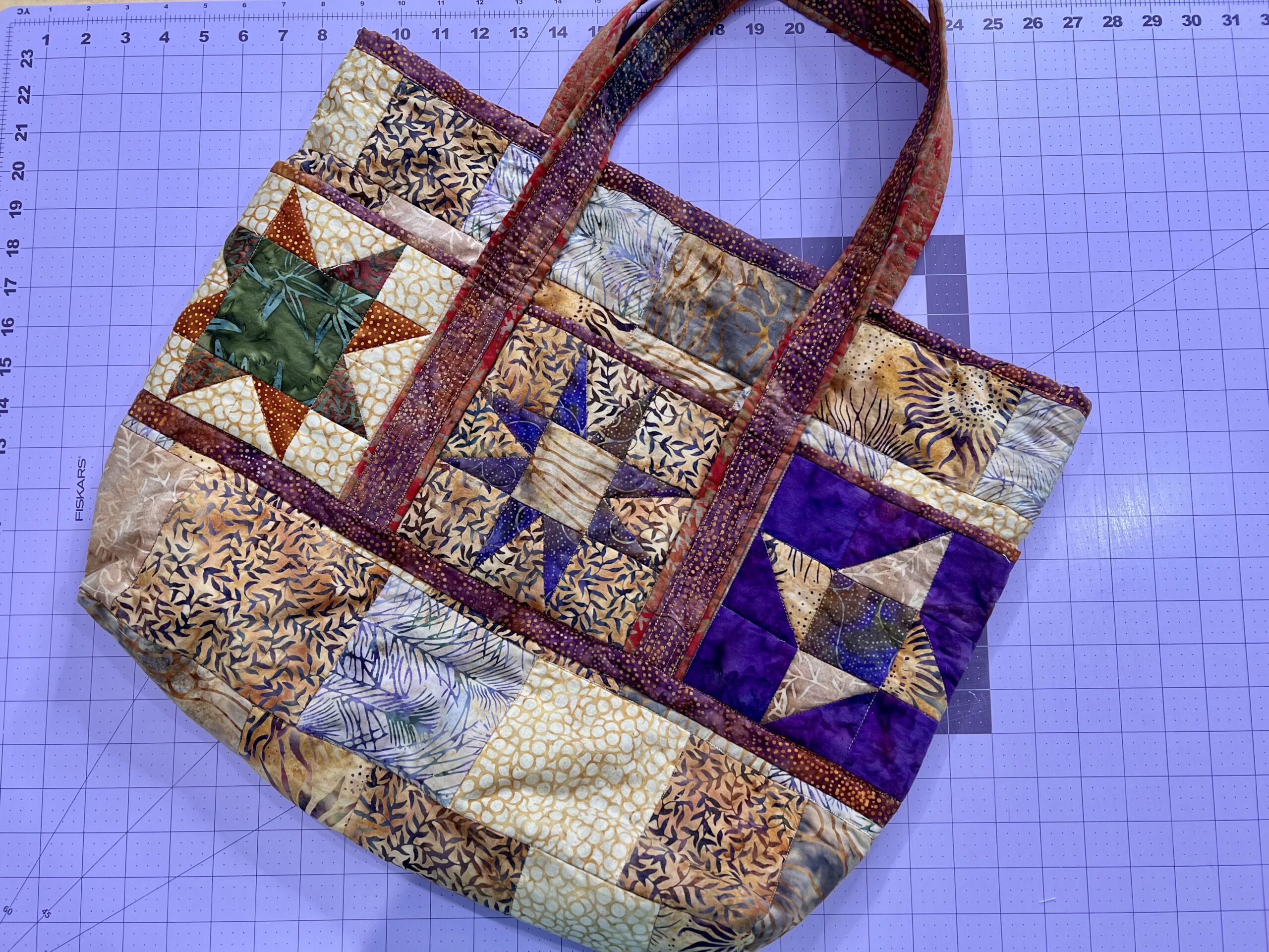 Find a favorite tote bag pattern and replace a solid fabric with a quilt block. For example, this bag uses various blocks of the same size to make the pockets. Adjustments may need to be made, but the block can really jazz up the look of a bag.